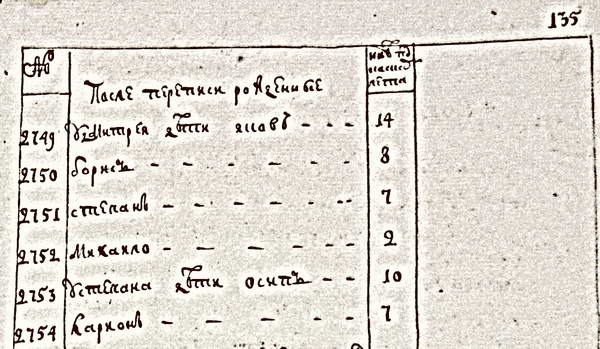 1-2: После переписи рождённые: Дмитрея дети: Яков, 14, Борис, 8, Степан, 7, Михайло, 2