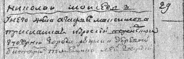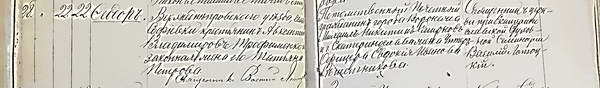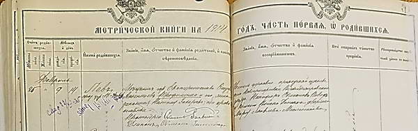 восприемники: учитель церковно-приходской школы села Новогригорьевки Верхнеднепровского уезда Никифор Самсонов Повод и волости Войска Донского дворянка Мария Яковлева Масленинова