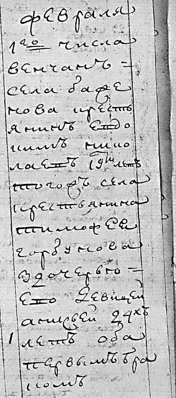 125-5: Февраля 1-го числа венчан села Баженова крестьянин Евдоким Николаев, 19 лет, того же села крестьянина Тимофея Горбунова з дочерью его девицей Анисьей, 24 лет, оба первым браком