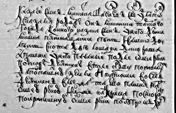 6-3: вниз по реке Оше до баяраку Коюрлыбаш, а от того баяраку с вершины по подбугорью да на бугор вышло, на бугру по толстую березу очерченую. Владеет по закладной ясашных татар Калмагулка да Базаргулка Миясовых з 205-го году. А с пахоты платит в казну великого Государя выдельной хлеб – пятой сноп. Сенных у него покосов около поль на сто копен. У него ж выпаханой земли подле Ныр речку десять десятин. Владеет истари, и были де у него на тое землю крепости, и те крепости у него в пожарное время згорели. И по указу великого Государя платить ему, Микитке з детьми, за пахоту ево вместо выделу в казну великого Государя отсыпным хлебом: четь с полуосьминою ржи, овса то ж.