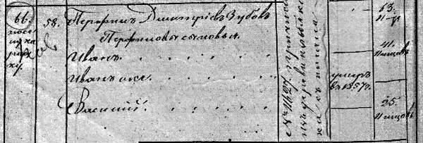 Перфиловы сыновья: Иван, 41 года 11 месяцов, Иван же, умер в 1857 г., Василий, 25 лет 4 месяцов