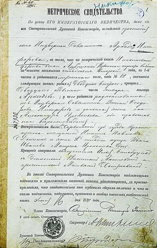 Таким образом, в самом важном для мальчика документе была словно проставлена печать на облике отца и на его собственном будущем. Восприемниками младенца были Харьковской губернии города Краснокутска мещанин Никита Павлов Донченко и жена 2-й гильдии купца Ивана Иванова Матрёна Прокопиева – возможно, тоже сестра Александры Прокопьевны? Крещение совершили священник Илья Вальбуциев, диакон Василий Акимов и причётник Матвей Хомяков. Свидетельство выдано Ставропольской духовной консисторией в июле 1894 года, видимо, оно потребовалось к сроку определения Аркадия на службу.
