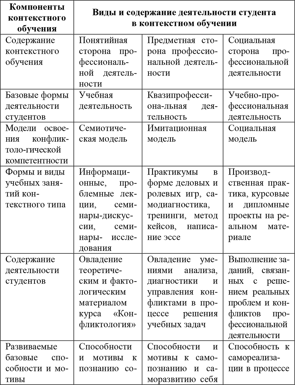 7. Теория контекстного обучения выступает концептуальной основой создания контекстной образовательной среды, где может быть организован эффективный процесс формирования и развития конфликтологической культуры личности специалиста. Она включает в себя: оформление учебного пространства и дизайн помещения, способствующие активному включению студента в освоение будущей профессии; учебное оборудование; отношение к обучающимся как равноправных субъектов деятельности; стиль сотрудничества преподавателей и обучающихся; обоснованное использование комплексов традиционных и новых, педагогических технологий (практикумов, деловых и ролевых игр, тренингов, решения кейсов и др.). В таких условиях учебная информация и сам процесс учения приобретают для студента личностный смысл, информация превращается в личное знание студента.