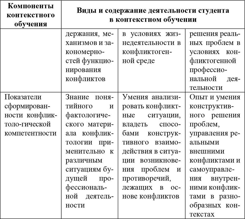 Конфликтологическая компетентность формируется в ходе целенаправленного изучения курса «Конфликтологии», когда человек начинает овладевать понятийным конфликтологическим аппаратом и понимать психологические механизмы поведения и деятельности человека. В исследованиях представлены различные приемы и методы формирования конфликтологической компетентности будущего специалиста (Г. М. Болтунова, 1994; З. З. Дринка, 2000; Д. В. Ивченко, 2000; Н. В. Самсонова, 2002; Т. Б. Беляева, 2008 и др.). В целом они основаны на идеях личностно развивающего, практико-ориентированного, компетентностного и других подходов в обучении. В отличие от них в процессе формирования конфликтологической культуры личности мы опирались на принципы теории контекстного обучения Целью курса «Конфликтология» является теоретическая и практическая подготовка специалиста к работе с конфликтами в ситуации проблемного межличностного взаимодействия. Требования к уровню теоретического освоения дисциплины обуславливались содержанием образовательного стандарта. В то же время в процессе преподавания особое внимание уделялось рассмотрению различных контекстов протекания и разрешения конфликтов, а также целенаправленному формированию профессиональных компетенций и конфликтологической культуры личности, обуславливающих оптимальное поведение человека на всех этапах протекания и управления конфликтами.