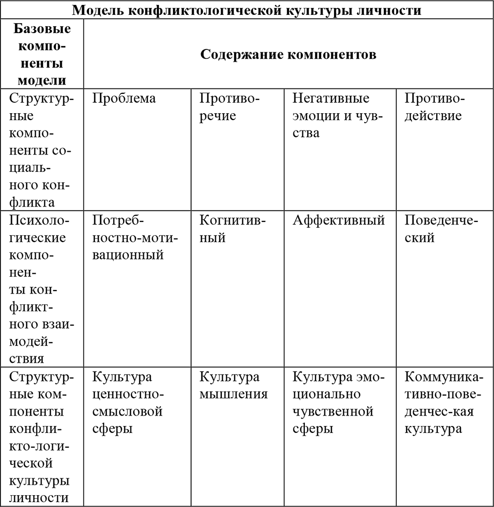 Предложенные в модели компоненты конфликтологической культуры личности (ценности, культура мышления, культура чувств, коммуникативно-поведенческая культура) соответствуют психологическим компонентам конфликтного взаимодействия (потребностно-мотивационный компонент, когнитивный компонент, аффективный компонент, поведенческий компонент) и направлены на их преодоление/устранение (табл. 10).