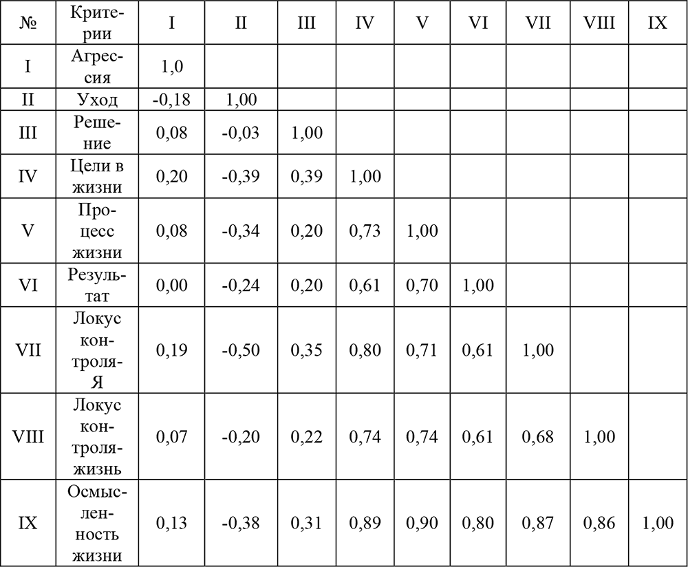 В то же время у юношей, в отличие от девушек, выявлено несколько значимых отрицательных корреляций типа реагирования «Уход» с показателями по следующим шкалам: «Цели в жизни» (к= – 0,39; р<0,05), «Процесс жизни» (к= – 0,34; р<0,05), «Локус контроля-Я» (к= – 0,50; р<0,01), «Осмысленность жизни» (к= – 0,38; р<0,01). То есть, чем в большей степени в конфликтной ситуации юноша склонен к уходу от решения проблемы, к избеганию контакта, тем менее он ставит значимые цели, получает удовольствие от процесса жизни, самостоятельно строит свою жизнь и переживает ощущение значимости жизни.