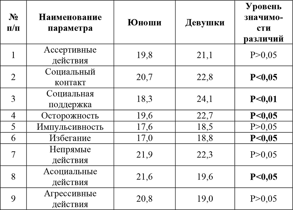 Результаты, представленные в таблице 16, указывают на то, что, по сравнению с юношами, у девушек значимо выше показатели по сравнению с юношами, более ориентированы на социальный контакт, социальную поддержку, осторожность, следующим копинг-стратегиям: социальный контакт (р<0,05), социальная поддержка (p<0,01), осторожность (p<0,05), избегание (p<0,05); и ниже по стратегии асоциальных действий (p<0,05). То есть, избегание. И в меньшей степени, чем юношам, им свойственны асоциальные действия. Данные различия соответствую гендерным характеристикам мужского и женского типов поведения в обществе.