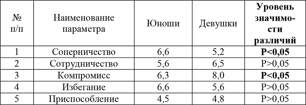 Представленные в таблице 17 результаты показывают, что у юношей значимо выше показатели по соперничеству (р<0,05), а у девушек по компромиссу (р<0,05). То есть, юноши, по сравнению с девушками, в большей степени склонны к соперничеству в конфликтных ситуациях, а девушки, по сравнению с юношами, в большей степени склонны к компромиссу, что так же соответствует гендерным характеристикам мужского и женского типов поведения.
