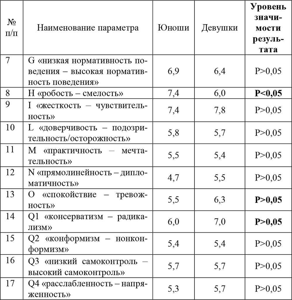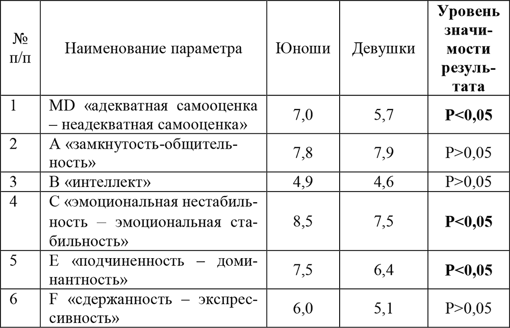 Из представленных в табл. 20 результатов следует, что у юношей, по сравнению с девушками, выявлены более высокие показатели по следующим шкалам (р<0,05): «адекватная самооценка – неадекватная самооценка», «эмоциональная нестабильность – эмоциональная стабильность», «подчиненность – доминантность», «робость – смелость».