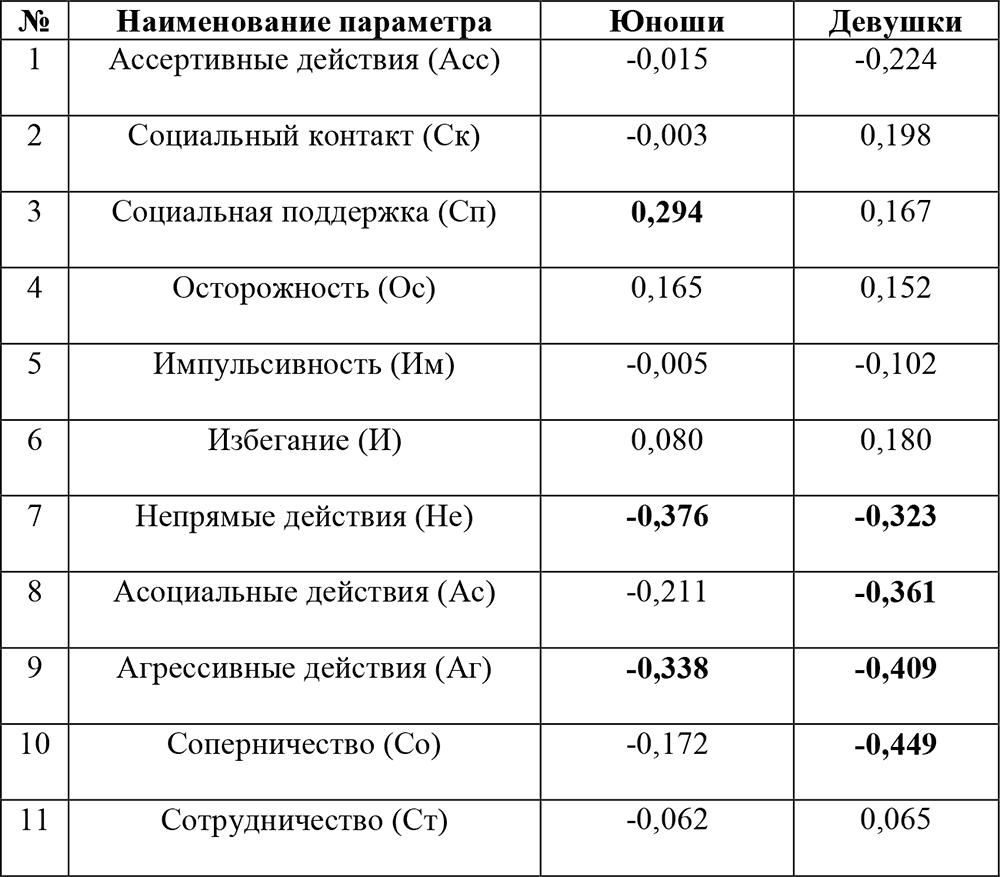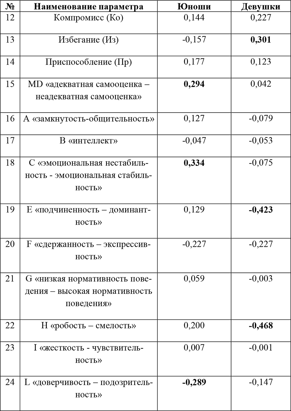 Таблица 19. Показатели корреляции уровня конфликтологической культуры и черт личности у юношей и девушек для р<0,05 (при n=45), к=0,288