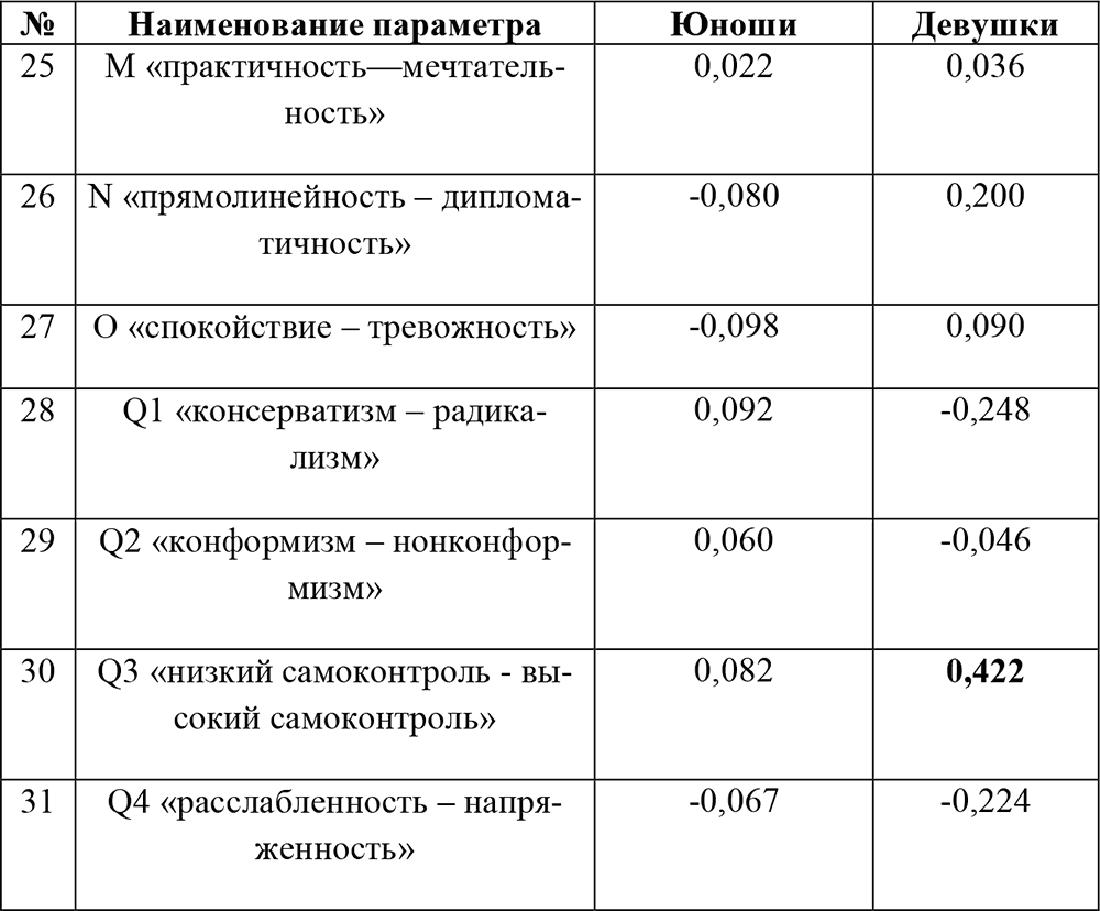 Таблица 15. Таблица корреляций исследуемых особенностей личности (юноши)