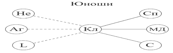 Из представленных на рис. 9 результатов следует, что у юношей конфликтологическая культура положительно коррелирует с копинг-стратегией «социальная поддержка» (СП) (к=0,294; р<0,05), со шкалой МД «самооценка», со шкалой С «эмоциональная нестабильность – эмоциональная стабильность» (к=0,334; р<0,05); отрицательно коррелирует с непрямыми действиями (Не) (к=-0,376; р<0,01), агрессивными действиями (Аг) (к=-0,338; р<0,05), со шкалой L «доверчивость-подозрительность» (к=-0,289; р<0,05), То есть, чем выше у юношей уровень конфликтологической культуры, тем менее они склонны к подозрительности, к агрессивными и непрямым действиям, и в то же время более эмоционально стабильны, доверчивы, ориентированы на социальную поддержку и имеют более высокую самооценку.
