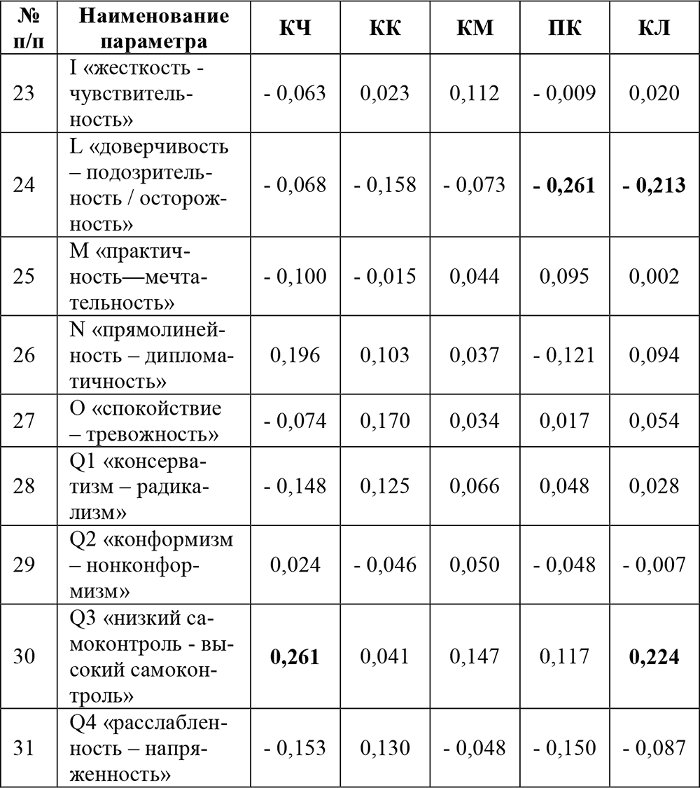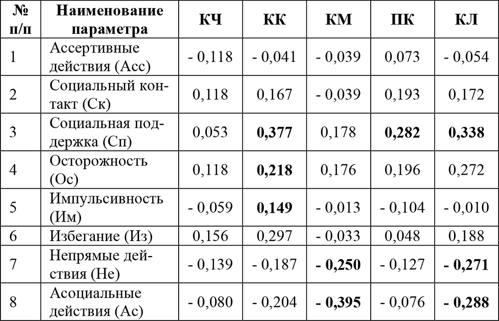 Поведенческая культура (ПК) положительно связана с копинг-стратегией «социальная поддержка» (к=0,282; р<0,01), стилем «компромисс» (к= 0,244; р<0,05), фактором А «замкнутость-общительность» (к=0,232; р<0,05), отрицательно связана со копинг-стратегией «агрессивные действия» (к= – 0,296; р<0,01), шкалой Е «подчиненность-доминантность» (к= – 0,216; р<0,05), шкалой L «доверчивость-подозрительность» (к= – 0,261; р<0,05). То есть, чем выше уровень поведенческой культуры, тем выше способность к поиску социальной поддержки, компромиссу, коммуникабельности, и тем меньше стремление к агрессивным действиям, доминантности, подозрительности.