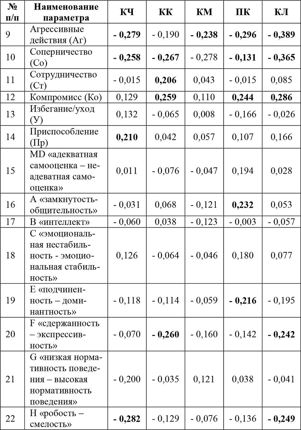 Таблица 20. Показатели корреляции компонентов конфликтологической культуры, стратегий поведения и черт личности для р<0,05 (при n=90), к=0,205