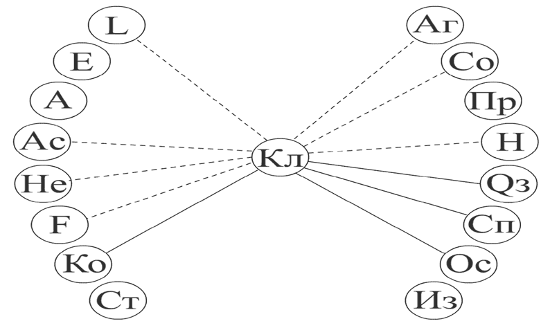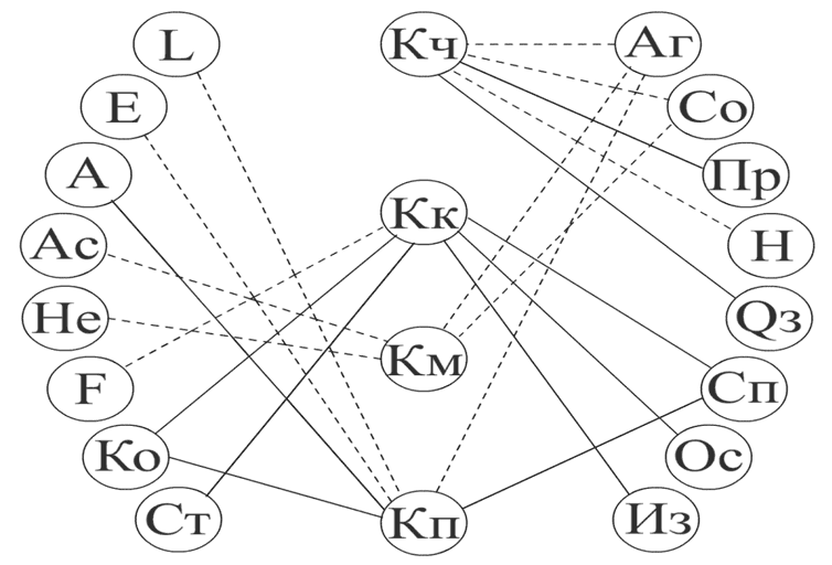 Как следует из рис. 12, конфликтологическая культура имеет положительные связи с копинг-стратегиями «осторожность» (Ос) (к=0,272; р<0,01), «социальная поддержка» (Сп) (к=0,337; р<0,01), «компромисс» (К) (к=-0,286; р<0,01), со шкалами Q3 «низкий самоконтроль – высокий самоконтроль» (к=-0,224; р<0,05) и отрицательную связь с копинг-стратегиями «агрессивные действия» (Аг) (к=-0,389; р<0,01), «соперничество «Со» (к=-0,365; р<0,01), «непрямые действия» (Не) (к=0,371; р<0,05) и со шкалами Н «робость-смелость» (к=-0,249; р<0,05), F «сдержанность-экспрессивность» (к=-0,242; р<0,05), L «доверчивость-подозрительность» (к=-0,213; р<0,05), Н «робость-смелость» (к=-0,249; р<0,05).