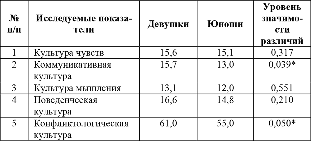 Средние арифметические показатели уровня развития конфликтологической культуры у юношей и девушек представлены в таблице 21.