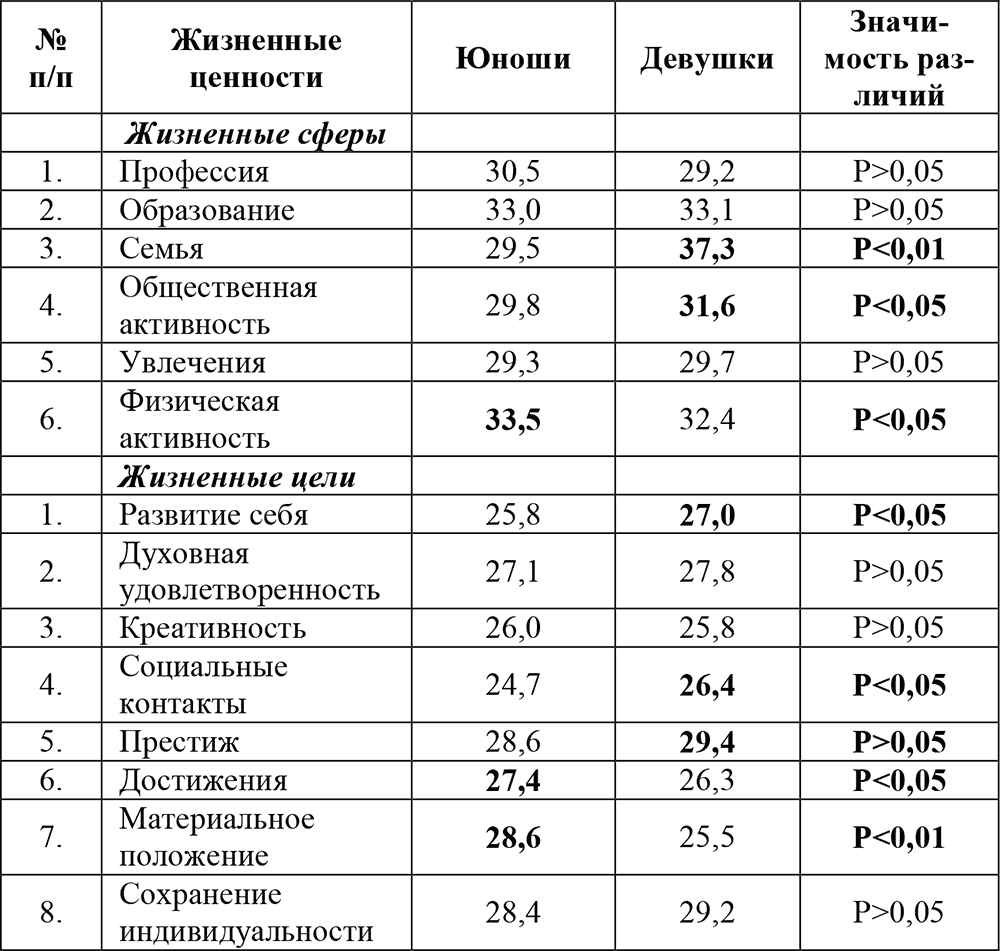 По жизненным целям: девушки по сравнению с юношами в большей степени стремятся к развитию себя (р<0,05), социальным контактам (р<0,05); у юношей более высокие показатели в стремлении к достижениям (р<0,05), и к высокому материальному положению (р<0,01).