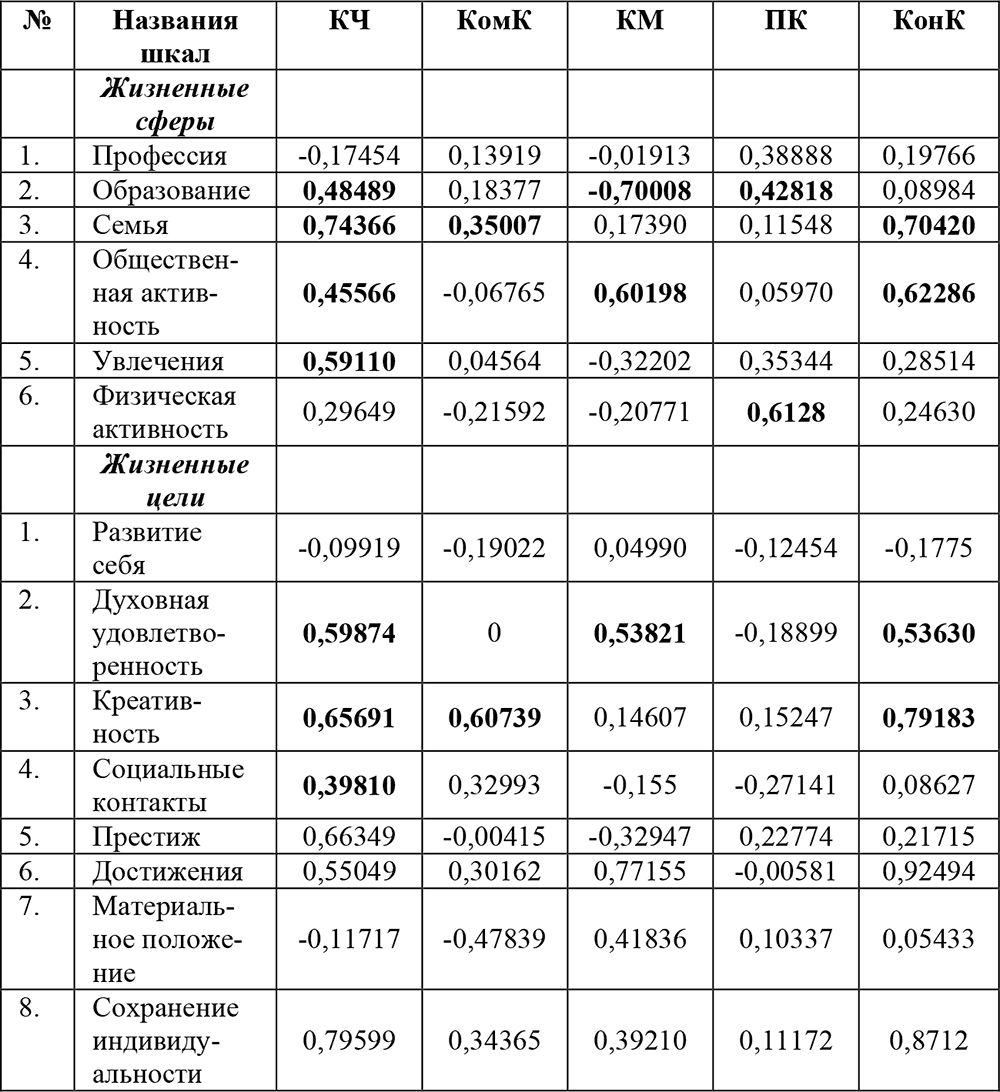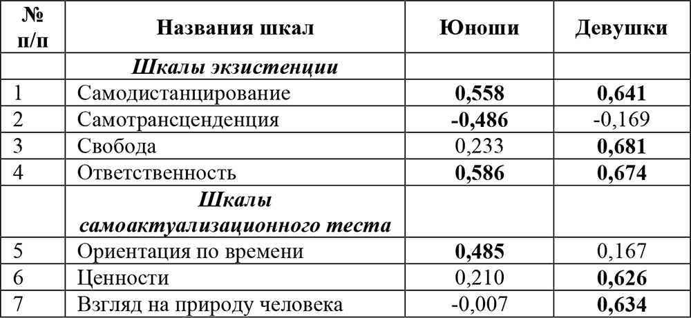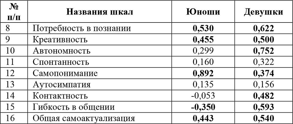 У девушек ККЛ положительно коррелирует со шкалами: «ценности», «взгляд на природу человека», «потребность в познании», «креативность», «автономность», «самопонимание», «контактность», «гибкость в общении». Для девушек уровень ККЛ является более связанным с уровнем их самоактуализации.