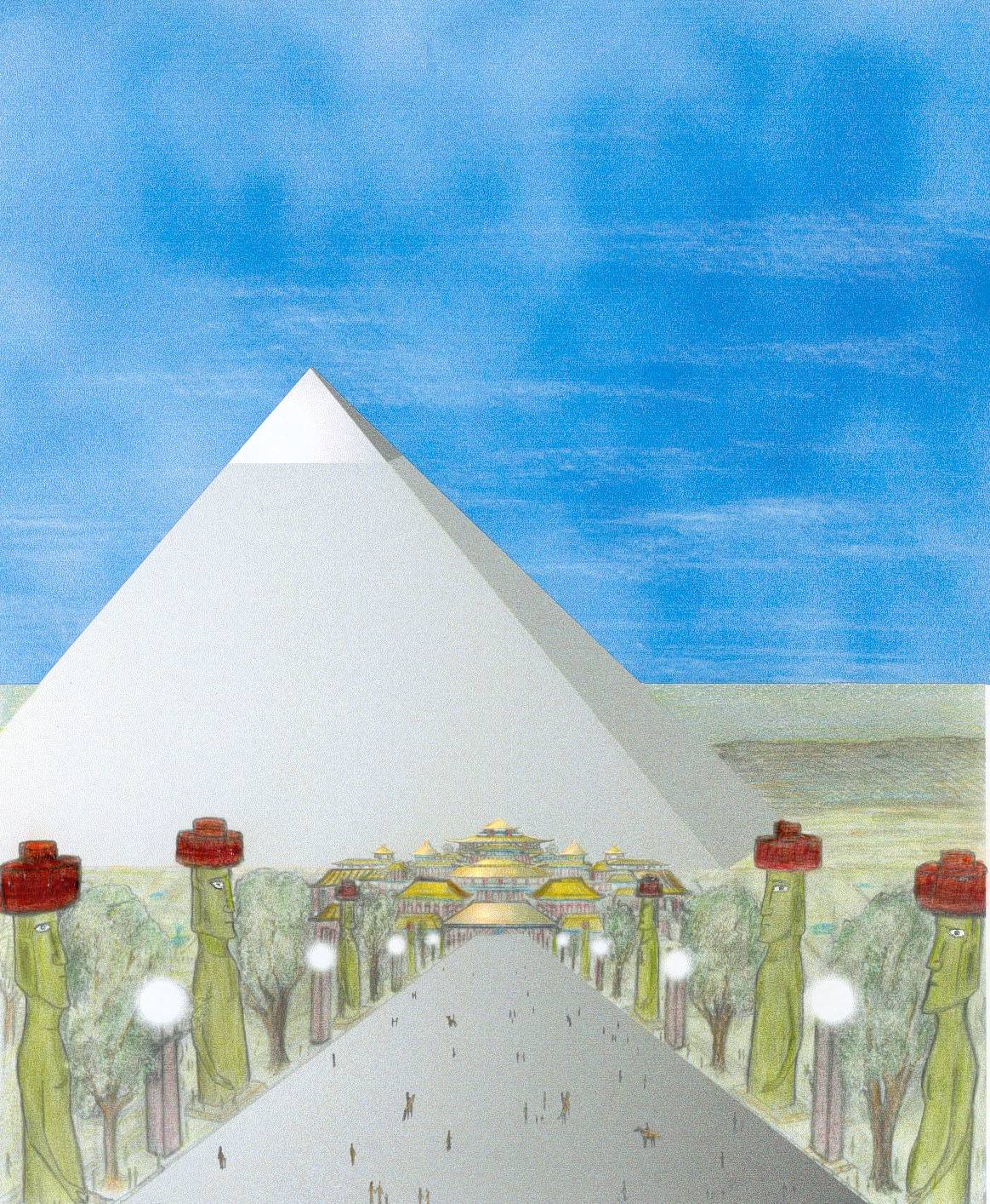 Люди, одетые в туники различных стилей и цветов, группами прогуливались под деревьями или около водоёмов. Некоторые сидели в медитации под цветочными беседками, специально предназначенных для их комфорта и укрытия. Надо всем этим доминировало сооружение, которое виднелось вдали за дворцом – гигантская пирамида.
