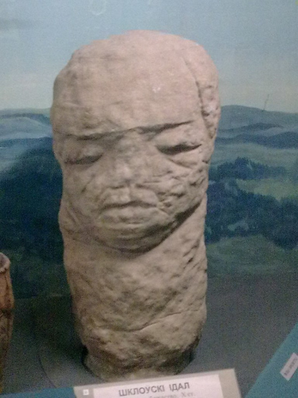 «Шкловский идол – скульптура, изображающая языческое божество, найденная в 1963 году около белорусского города Шклов. Хранится в Национальном историческом музее Республики Беларусь в Минске. Шкловский идол изображает верхнюю часть мужского тела, обтёсанную в виде столба цилиндрической формы, нижняя честь которого имеет форму постамента. Фигура высечена из песчаника, составляет в высоту 1,2 метра и весит около 250 килограммов. Идол имеет лицо с рядом индивидуальных черт: четко прослеживаются глаза, по-видимому, закрытые, рот и усы. Сама фигура несомненно имеет фаллические очертания. На обозрение научному сообществу идол впервые был представлен в публикации Георгия Васильевича Штыхова. Идол был найден мальчиками из деревни Старый Шклов на берегу реки Серебрянка в урочище Кукушкин ров (Зязюлін роў). Взрослые выкопали скульптуру, дав ей шутливое название „олух“. Скульптура была перевезена в Минск археологом Леонидом Давыдовичем Поболем. При транспортировке в кузове грузовика идол получил повреждения: был сильно потёрт, его лицо оказалось немного стёсанным. Обзор основных теорий, касающихся идола, был хорошо отражен в докладе Забашты. Проблемы с атрибуцией, то есть определением времени его создания и этнокультурной принадлежности населения, которое ему поклонялось, вызваны отсутствием у находки подходящих для атрибуции признаков. По широко распространённой версии, выдвинутой Г. В. Штыховым, идол относится к Х веку, по другим – к VІ – Х, VІ – VII или VІ – XIII векам. Все версии являются гипотетическими и не имеют надёжного обоснования. Ещё одну версию предложил Забашта, который на основании датировок археологических памятников в окрестностях находки и похожих языческих идолов сделал вывод, что скульптура относится к XII – XIII векам. Забашта склоняется к версии, что идол оставило славянское население, но вместе с тем отмечает сходство скульптуры с так называемыми балтскими идолами из Риги и столбоподобными идолами из святилищ, обнаруженных в Смоленской области. Также невозможно соотнести идол с определенным божеством, но, опираясь на косвенные данные, как, например, закрытые глаза идола, можно предположить о его принадлежности к хтоническому миру умерших предков. Фаллическая форма может свидетельствовать об отношении функции божества к плодовитости и плодородию».