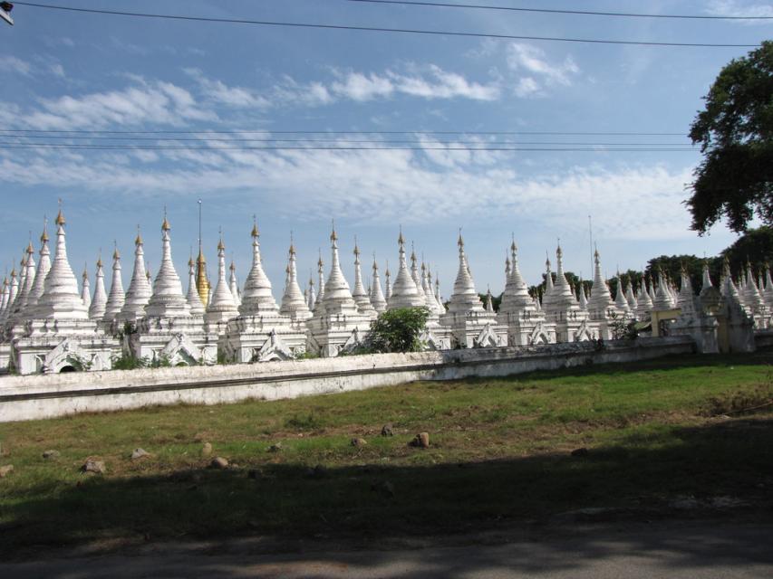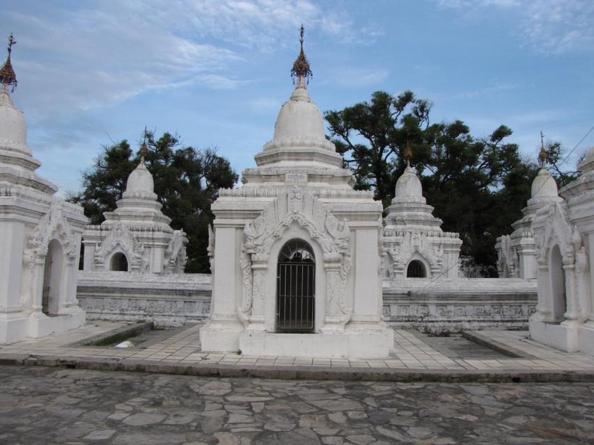 Но самое большое впечатление произвели пагоды Куходо и Садамуни. Они так же красивы и богаты, как и другие. Они построены тем же Миндоном Мином в 19 веке. Главное в них – это каменные книги. Такого на земном шаре нигде нет. В 730 пагодах (небольших, беленьких), стоящих четкими рядами, находятся плиты, на которых выбиты с двух сторон страницы буддийской библии – Трипитаки. Каждая плита 1х1.5 м, из мрамора. Семь с половиной лет шла эта работа. Их не только выбивали в камне, но еще и редактировали и проверяли. А ведь в это время было уже книгопечатание. Но Миндон решил, что Буддийские традиции должны остаться на века, таким образом, сохраняя пятую незыблемую, священную сферу, не подверженную космическим катастрофам.