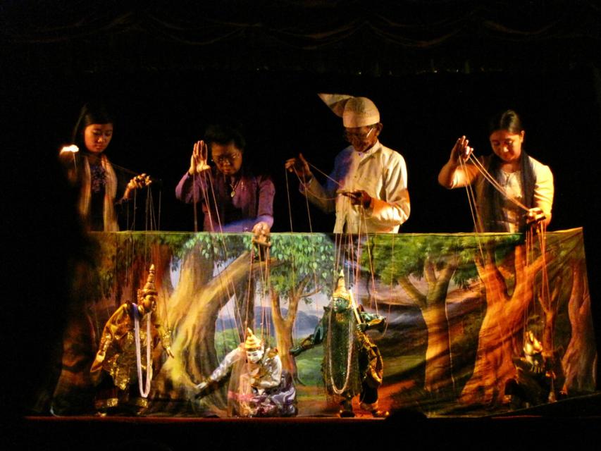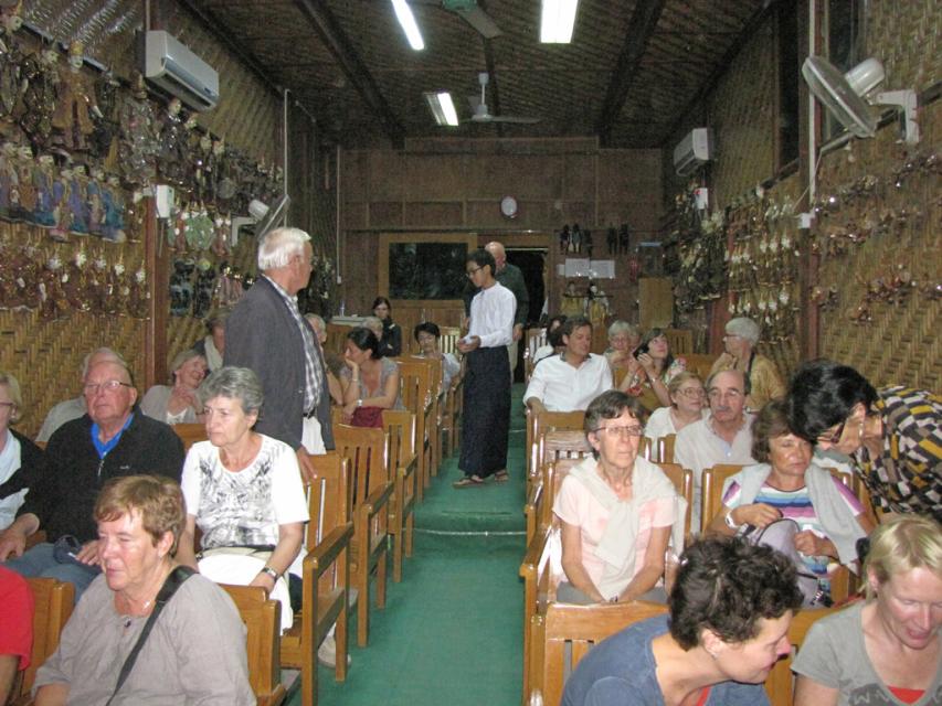 Вечером пошли в Знаменитый бирманский театр марионеток. Этому искусству больше 1000 лет. Небольшое, красивое деревянное здание, на стенах маски, которые можно купить. Маленькая сцена, а под ней оркестровая яма (на 5-6 человек). На сцене играют и куклы, и люди. Все это красочно, музыкально и непонятно.