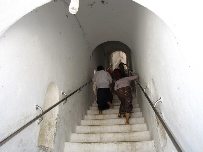 Дальше по пути был красавец храм Умин Тхозе пагода. Его фасад чаще всего печатают на рекламных проспектах Мьянмы. Поднявшись опять под палящими лучами солнца (правда, всю лестницу накрывала легкая крыша), вышли к изумительной пагоде, построенной полукругом. Вся белая с золотыми барельефами. Ее называют «храмом 30 пещер». Вообще-то, ей 1000 лет, но, видимо, ее частенько реставрируют, так как, выглядит совсем новенькой. Внутри одна за другой стоят в ряд статуи Будды во всех состояниях. Даже в женском обличьи. А под ними, как и везде, стеклянные ящики с деньгами. Ни у людей, ни у государства денег ни на что нет, а на Будду всегда есть. Когда же поймут, что лучший путь к успеху: вера в себя? Кто знает, какое сегодня настроение у Будды, Иисуса и Аллаха?