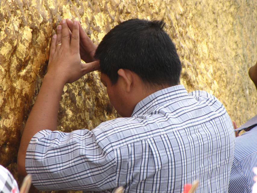 Толпа увлеченно двигалась к святыне. Все обустроено очень здорово и красиво. Еще на подходе виден этот камень. Его высота 25-27 метров (вместе с маленькой пагодкой на нем, высотой 7 метров). Облеплен пластинками из суссального золота во много слоев. Вошли на покрытую мраморными плитами площадь, на которой едят и даже спят, чтобы у святыни встретить рассвет. Вокруг расположились небольшие красивые дома: учебный центр, помещение для нирваны (по нашему – впадать в прострацию). А дальше несколько ступеней вниз – и Он, золотой и святой, почти рядом. Но женщинам (по определению грешным) подходить ближе, чем на 10 метров, нельзя, чтобы не притронуться: боятся, что упадет. А вот мужчины прилипают к нему лбом, лицом, плечами, грудью и стоят в оцепенении.