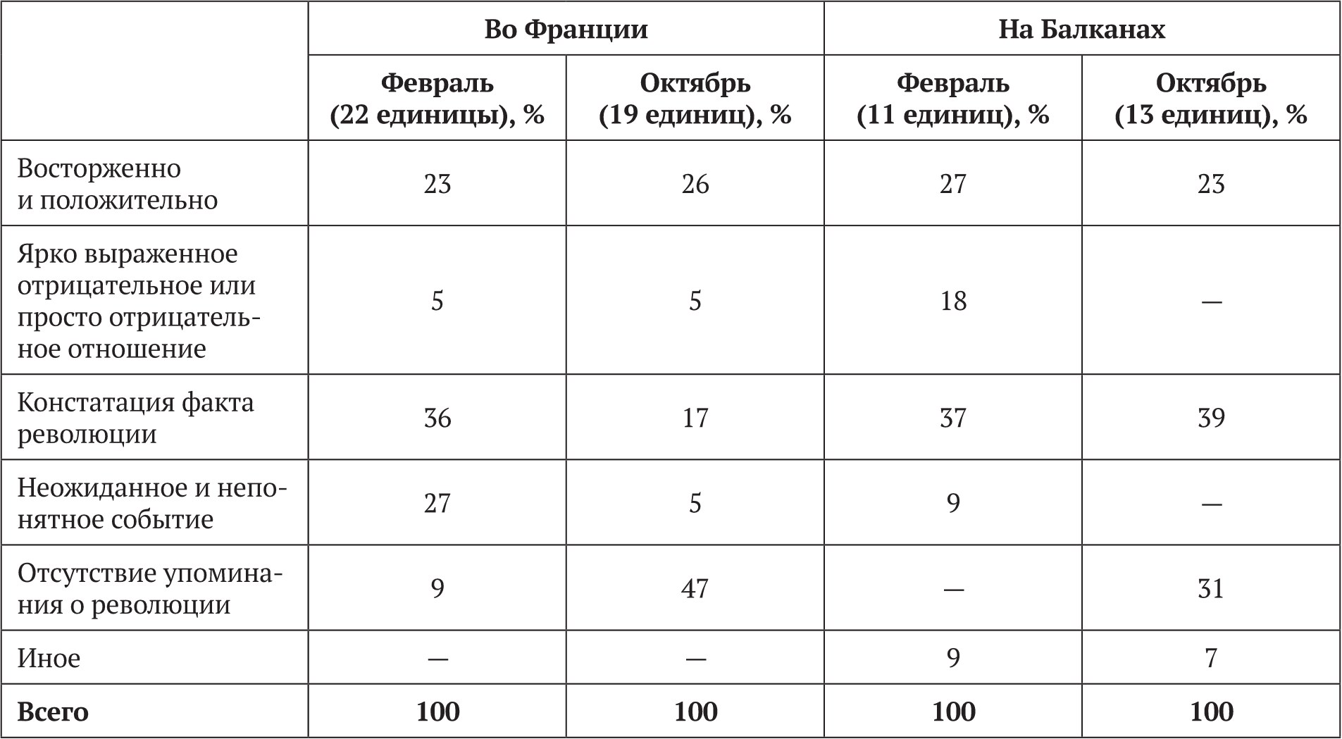 Во-первых, к Февралю во Франции и на Балканах источники отнеслись одинаково восторженно положительно (23 и 25%) и в равной мере совершенно спокойно (36 и 37%), но на Балканах процент недовольных обеими революциями был несопоставимо выше (5 и 18%).