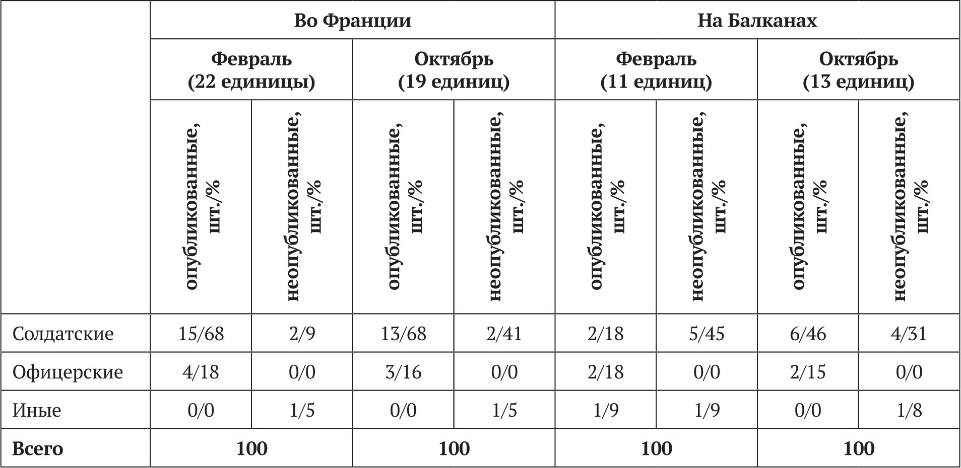 Общее количество источников по изучению настроений среди русских войск на Балканах – 11 единиц (100%), из которых 7 солдатских (64%), 2 офицерских (18%) воспоминаний, Отчет Эвертса (9%) и Доклад Временному правительству (9%).