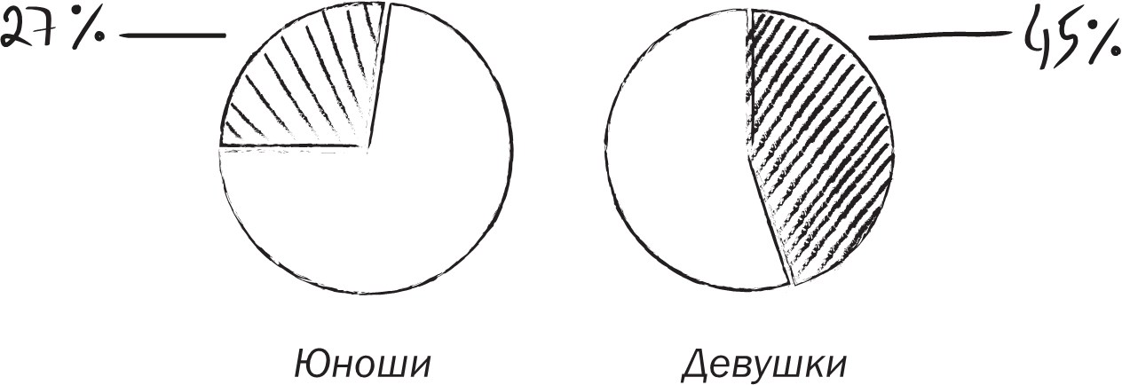 Рис. 2.1. Мысль о самоубийстве появляется в голове у 27% российских юношей и у 45% девушек