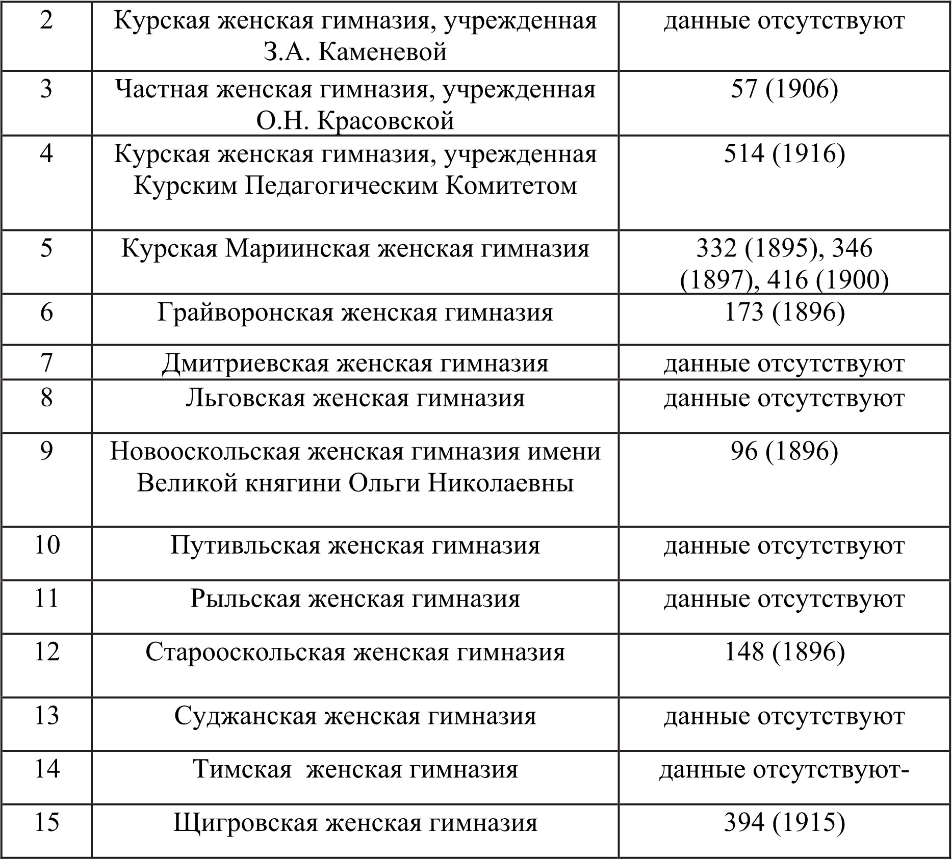 Таблица 1. Число женских учебных заведений и учащихся в них в Курской губернии в начале XX в. Таблица содержит сведения о гимназиях и количестве учащихся в них, в том числе учебные заведения на территории нынешней Белгородской области (тогда входила в состав Курской губернии).