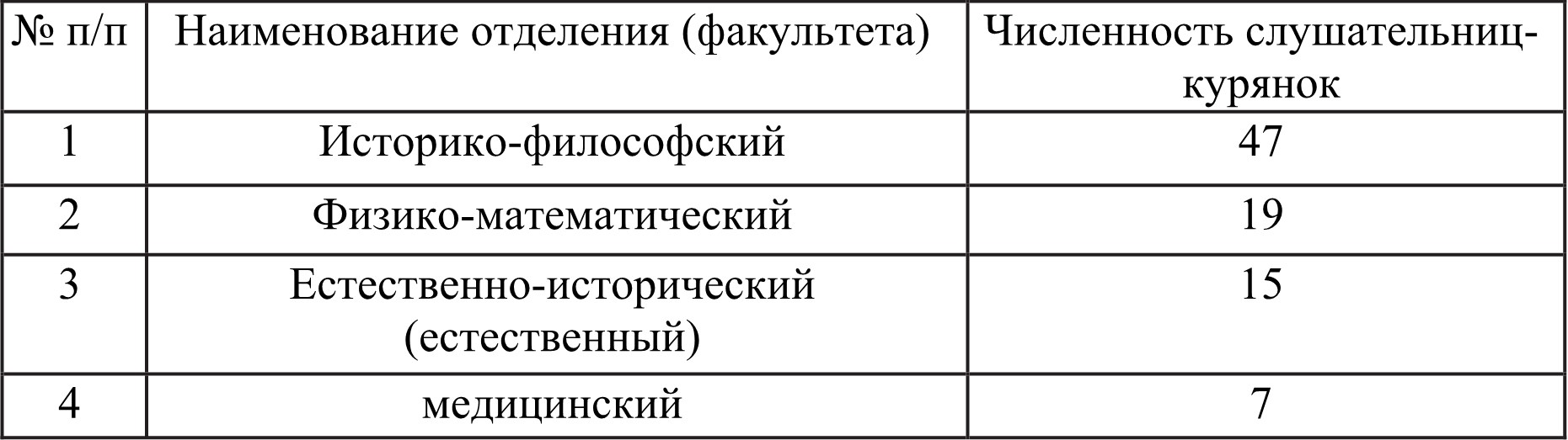 Также как и средняя женская школа, высшие женские курсы формировались на основе принципа всесословности. Среди курянок-слушательниц курсов В.И. Герье было немало дочерей священнослужителей, государственных чиновников, а также мещан, занимавшихся различного рода коммерческими делами. Главное – наличие необходимых для оплаты обучения средств.