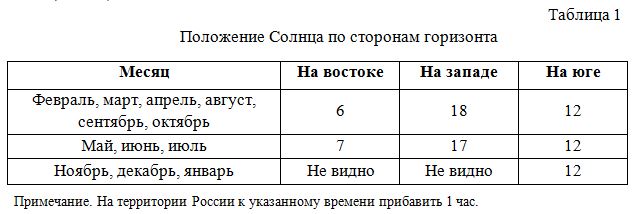 По положению Солнца. Этот способ позволяет определить стороны горизонта в хорошую погоду утром, в полдень и вечером. Для этого необходимо знать, в какие часы Солнце находится на востоке, юге и западе в различное время года (табл. 1).