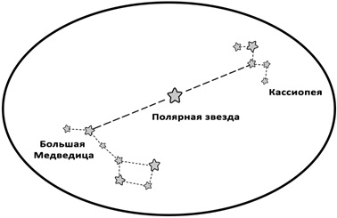 В ситуации, когда созвездие Большая Медведица закрыто облачностью или расположено слишком низко на небе, отыскать Полярную звезду может помочь созвездие Кассиопея. Оно расположено почти всегда против созвездия Большая Медведица и так же, как и оно, вращается вокруг Полярной звезды. Созвездие Кассиопея состоит из пяти ярких звезд, напоминающих сильно сплюснутую букву «М». Полярная звезда расположена прямо против центральной звезды созвездия примерно на том же расстоянии, что и от Большой Медведицы (рис. 17).