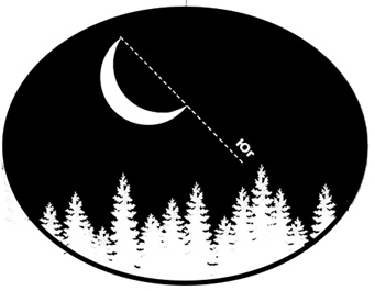 Существует еще один упрощенный способ ориентирования по луне, находящейся в первой или последней своей четверти (то есть когда видна лишь одна четвертая часть диска.) В этом случае надо мысленно соединить концы «рожек» месяца прямой линией и продолжить ее вплоть до пересечения с горизонтом. В Северном полушарии эта точка будет указывать приблизительно на юг. В южном – соответственно на север (рис. 18).