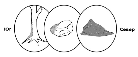 У сосны, у комля, ближе к корням, нередко обильно нарастает мох, лишайники. Мох любит сырость, тень, норовит спрятаться от прямых солнечных лучей за стволом и, значит, указывает на север. Точно так же мох располагается на отдельных камнях, пнях, на скалах, на стенах старых деревянных и каменных строений. Из лиственных деревьев мхом и лишайниками больше всего обрастают осины и тополя. В случаях, когда ствол дерева покрыт разросшимся лишайником вкруговую, надо ощупать его рукой. С северной стороны лишайник более влажный, плотный, его больше. Засохшие деревья, пни, упавшие на землю стволы в большей степени гниют с северной стороны (рис. 19).