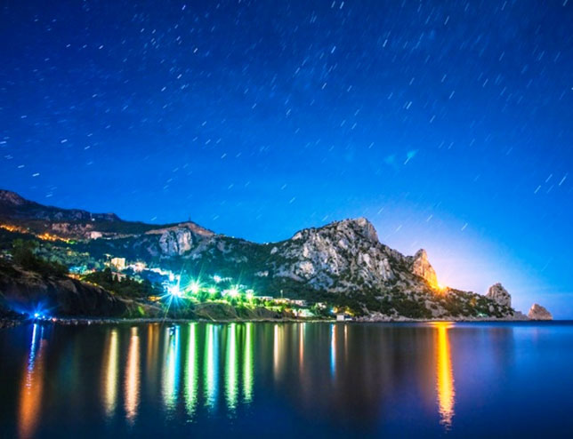 Вид на гору Кошка близ Симеиза, Крым. Снято с пирса пос. Кацивели, от радио телескопа РТ-22. Выдержка около 5 минут.