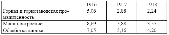 Тесно связан с проблемой дисциплины на рабочем месте был вопрос качества и производительности труда. Один из руководителей экономической политики большевиков А. Ломов признавал, что ноябрь-декабрь 1917 г., а также начало 1918 г. были отмечены «значительным падением производительности труда»133. Так, ощутимо по сравнению с дореволюционным временем упало производство винтовок на Ижевском заводе, в то время как на Сестрорецком заводе оно и вовсе прекратилось134. В отдельные периоды 1918 г. снижалась производительность труда в главных железнодорожных мастерских Николаевской железной дороги135. Пережив краткий период подъёма, к марту 1918 г. производительность труда снизилась на Охтинских пороховых заводах136. С горечью отмечали падение производительности труда на своём предприятии рабочие Семянни-ковского завода137. Определённое падение производительности труда наблюдалось в летние месяцы 1918 г. на заводе Новый Лесснер, в июне-августе того же года уменьшается производство продукции в связи с падением производительности труда на Сампсониевской мануфактуре. Отмечались тенденции снижения производительности труда на Ликинской мануфактуре. Приходится признать, что подобного рода явления носили не эпизодичный, а всеобщий характер. В целом по стране падение производительности труда началось ещё после Февральской революции, как и другие негативные моменты развития промышленности усилившись после Октября. Так, в 1917 г. производительность труда в промышленности составляла 67% от уровня 1913 г., а в 1918 г – 34%. Валовая продукция на одного рабочего в год в 1917 г. равнялась 1482,1 довоенных рубля, ав1918г. – уже 917,3, что составляло 61,9% от уровня 1917 г. По отдельным отраслям производства к 1918 г. картина падения индивидуальной производительности рабочих может быть показана следующим образом138: