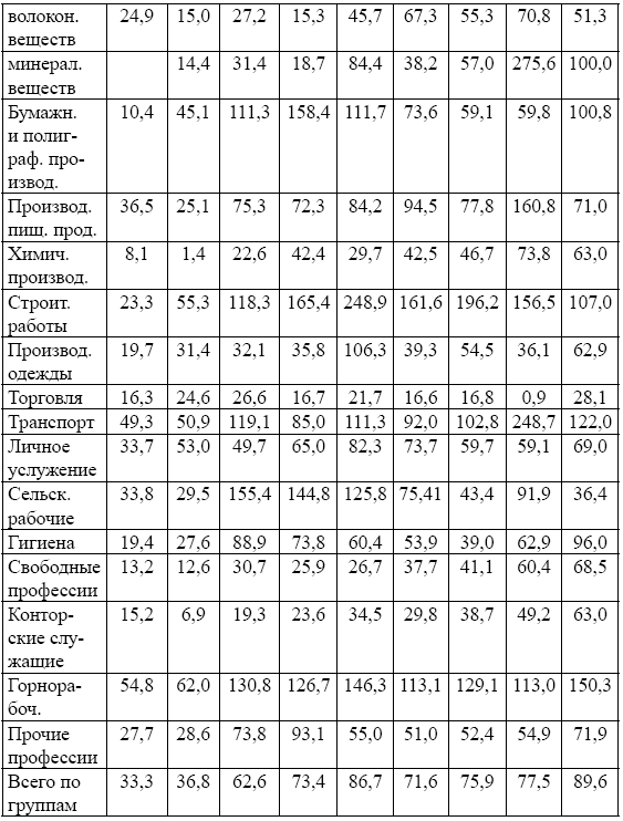 Уровень безработицы различался не только по отдельным районам, но и по отраслям производства, меняясь с течением времени в зависимости от состояния рынка труда, как это отражено в следующей таблицей152: