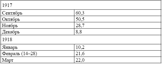 Как видно из приведённой таблицы, наиболее плохо выполнялись наряды по снабжению Москвы хлебом в декабре 1917 г., а также в январе 1918 г. В дальнейшем обстановка несколько нормализовалась, но оставалась критической, и это несмотря на то, что с прекращением войны общий план заготовок по стране сократился с 60-65 млн пудов в месяц до 30—35 млн пудов, и, следовательно, можно было бы ждать, что степень его выполнения существенно возрастёт. Но этого так и не произошло158.