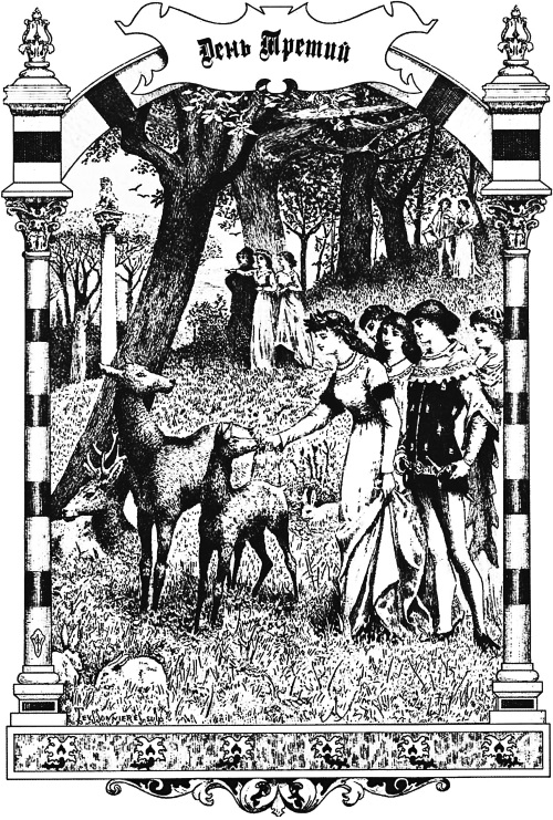 Уже заря с приближением солнца из алой стала золотистой, когда в воскресенье королева, поднявшись, подняла и все свое общество, между тем как сенешаль задолго перед тем послал к месту, куда надлежало идти, много необходимых вещей и людей, которые приготовили бы там все нужное. Увидев, что королева пустилась уже в путь, он велел быстро нагрузить все остальное, точно там снялись лагерем, и отправился с грузом и служителями, какие оставались при дамах и мужчинах. И вот королева, в обществе и сопровождении своих дам и трех юношей, напутствуемая пением двадцати, пожалуй, соловьев и других птичек, ступая тихим шагом по тропинке не слишком торной, но полной зеленой травы и цветов, начинавших раскрываться с появлением солнца, направилась к западу и, болтая, шутя и смеясь со своими спутниками, не прошла и двух тысяч шагов, как привела их раньше половины третьего часа утра к красивому, роскошному дворцу, лежавшему на холме, несколько выше долины.