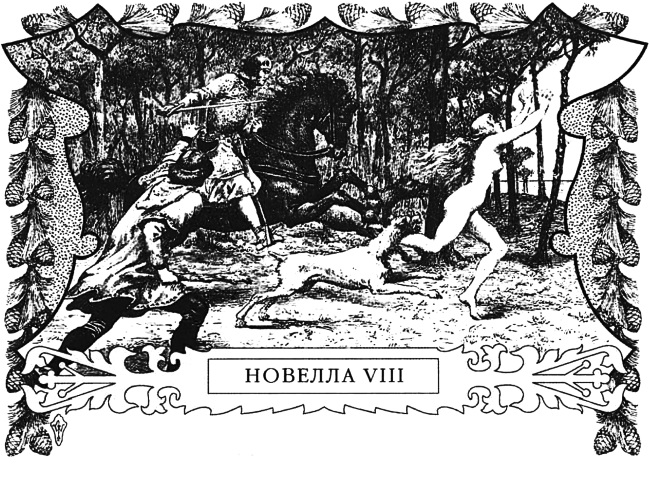 Случилось, почти в самом начале мая, в превосходную погоду, что ему вспомнилась его жестокая дама; приказав всем своим домашним оставить его одного, дабы ему можно было помечтать о ней в свое удовольствие, погруженный в мысли, идя, куда несли ноги, он один добрался до соснового леса. Уже почти миновал пятый час дня, и он прошел с полмили в лесу, не вспомнив ни о пище, ни о чем другом, как вдруг ему показалось, что он слышит страшный плач и резкие вопли, испускаемые женщиной; его сладкие мечты были прерваны, и, подняв голову, чтобы узнать, в чем дело, он изумился, усмотрев себя в сосняке; затем, взглянув вперед, увидел бежавшую к месту, где он стоял, через рощу, густо заросшую кустарником и тернием, восхитительную обнаженную девушку с растрепанными волосами, исцарапанную ветвями и колючками, плакавшую и громко просившую о пощаде. Помимо этого, он увидел по сторонам ее двух громадных диких псов, быстро за ней бежавших и часто и жестоко кусавших ее, когда они ее настигали, а за нею на вороном коне показался темный всадник, с лицом сильно разгневанным, со шпагой в руке, страшными и бранными словами грозивший ей смертью. Все это в одно и то же время наполнило его душу изумлением и испугом и, наконец, состраданием к несчастной женщине, из чего родилось желание спасти ее, если то возможно, от такой муки и смерти. Видя себя безоружным, он бросился, чтобы схватить ветвь от дерева вместо палки, и пошел навстречу собакам и всаднику. Но тот, увидя это, закричал ему издали: «Не мешайся, Настаджио, дай псам и мне исполнить то, что заслужила эта негодная женщина». Пока он говорил это, собаки, крепко схватив девушку за бока, удержали ее, а подоспевший всадник слез с лошади. Настаджио, приблизившись к нему, сказал: «Я не знаю, кто ты, так хорошо знающий меня, но все же скажу тебе, что велика низость вооруженного рыцаря, намеревающегося убить обнаженную женщину и напустить на нее собак, точно она – дикий зверь; я во всяком случае стану защищать ее насколько смогу». Тогда всадник сказал: «Настаджио, я родом из того же города, что и ты, и ты был еще маленьким мальчиком, когда я, которого тогда звали Гвидо дельи Анастаджи, был гораздо сильнее влюблен в ту женщину, чем ты в Траверсари, и от ее надменности и жестокости до того дошло мое горе, что однажды этой самой шпагой, которую ты видишь в моей руке, я, отчаявшись, убил себя и осужден на вечные муки. Немного прошло времени, как эта женщина, безмерно радовавшаяся моей смерти, скончалась и за грех своего жестокосердия и за радость, какую она ощутила от моих страданий, не раскаявшись в том, ибо считала, что не только тем не погрешила, но и поступила как следует, осуждена была на адские муки. И как только она была ввержена туда, так мне и ей положили наказание: ей бежать от меня, а мне, когда-то столь ее любившему, преследовать ее, как смертельного врага, не как любимую женщину; и сколько раз я настигаю ее, столько же раз этой шпагой, которой я убил себя, убиваю ее, вскрываю ей спину, а это сердце, жестокое и холодное, куда ни любовь, ни сострадание никогда не в состоянии были проникнуть, вырываю, как ты тотчас увидишь, из тела со всеми другими внутренностями и бросаю на пожрание собакам. И не много проходит времени, как она, по решению Господнего правосудия и могущества, воскресает, как бы не умирала вовсе, и снова начинается мучительное бегство, 