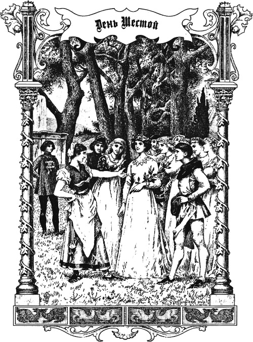 Когда окончилась новелла Дионео, над которой женщины смеялись лишь немного, более из стыдливости, чем от недостатка удовольствия, королева, увидев, что настал конец ее правлению, поднялась и, сняв с головы лавровый венок, игриво возложила его на голову Елизы со словами: «Теперь, мадонна, вам приказывать». Приняв этот знак почести, Елиза поступила так, как поступали прежде, ибо, дав наперед сенешалю приказание относительно всего, что надо было сделать за время ее правления, сказала к общему удовольствию общества: «Мы часто слышали, что многим удавалось острыми словами, скорыми ответами и быстрой находчивостью притуплять подобающим образом зубы, которые на них острили, либо устранять грозившую опасность. Так как это сюжет прекрасный и может быть полезен, я желаю, чтобы завтра с Божией помощью беседа шла в этих границах, то есть о тех, кто, будучи задет каким-нибудь острым словом, отплатил за то либо скорым ответом и находчивостью избежал урона, опасности или обиды». Все очень одобрили это, почему королева, поднявшись, распустила всех до часа ужина. Видя, что королева встала, встало и все почтенное общество, и всякий по заведенному порядку предался тому, что более ему нравилось; лишь только умолкло пение цикад, королева велела всех позвать, и они отправились к ужину; весело поужинав, предались песням и пляске. Когда, по желанию королевы, завели танец, Дионео было приказано спеть канцону. Тот сейчас же начал: «Монна Альдруда, свой хвост задери, несу тебе добрые вести», над чем все принялись смеяться, особенно королева, которая приказала ему оставить эту песню и спеть другую. Говорит Дионео: «Мадонна, будь у меня цимбалы, я пропел бы: „Подними-ка полы, монна Лапа“, либо: „Под оливой травка“; или, хотите, я скажу: „Морская вода очень мне вредна“; но у меня нет цимбал, и потому выберите сами, какую хотите, из следующих. Может быть, вам понравится „Высунься, я тебя срежу, как майское деревце в поле“». – «Нет, спой другую», – сказала королева. «Коли так, – ответил Дионео, – разве спеть мне „Монна Симона все в бочку льет, а мы не в октябре“». Королева, смеясь, сказала: «Убирайся ты в недобрый час, скажи нам, коли угодно, хорошенькую, а этой мы не хотим». Дионео ответил: «Мадонна, не сердитесь, какая же вам больше нравится? Я их знаю больше тысячи. Хотите эту: „Уж ты, ракушка моя, коль не балую тебя“, либо „Потише, муженек“, или „Купила я петуха за сто лир“». Тогда королева, несколько рассердившись, хотя все другие смеялись, сказала: «Дионео, оставь шутки и спой нам хорошую; коли нет, ты можешь испытать на себе, как я умею гневаться». Услыхав это, Дионео, оставив балагурство, тотчас запел таким образом: