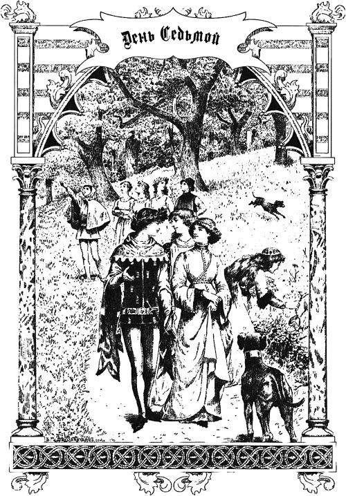 Уже все звезды удалились с восточной части неба, кроме одной, которую мы называем Луцифером, еще светившейся в белесоватой заре, когда сенешаль, поднявшись, отправился с большим обозом в Долину Дам, чтобы там все устроить согласно с распоряжением и приказом, полученным от своего господина. После его ухода не замедлил встать и король, которого разбудил шум вьючивших людей и лошадей; встав, он поднял заодно и дам и молодых людей. Лучи солнца едва пробивались, когда все пустились в путь; никогда еще, казалось им, соловьи и другие птички не пели так весело, как в то утро; сопровождаемые их песнями, они дошли до Долины Дам, где их встретило еще большее количество птичек, радовавшихся, казалось, их прибытию. Когда они обошли долину и снова осмотрели ее, она показалась им еще красивее, чем в прошлый день, потому что время дня более соответствовало ее красоте. Разговевшись хорошим вином и печеньем, они принялись петь, дабы не отстать от птичек, и долина пела вместе с ними, всегда вторя песням, которые они сказывали; а все пташки, точно не желая быть побежденными, присоединяли к ним новые, сладкие звуки. Когда настало время трапезы, столы поставлены были под свежими лаврами и другими красивыми деревьями поблизости озерка, все расселись, по благоусмотрению короля, и за едой смотрели, как рыба ходила в озере большими стаями, что давало им повод не только поглазеть, но и побеседовать. Когда трапеза пришла к концу и убраны были кушанья и столы, они, развеселившись пуще прежнего, принялись петь; а так как в разных местах маленькой долины были устроены кровати, которые разумный сенешаль распорядился окружить с боков и сверху французской саржей, можно было затем пойти и спать; а кто спать не хотел, мог сколько угодно пользоваться обычными им удовольствиями. Но когда настал час, что все уже встали и пора было приняться за рассказы, велено было, по приказанию короля, разостлать ковры неподалеку от места, где они трапезовали; все уселись вблизи озера, а король велел Емилии начать. Она так начала, весело улыбаясь.