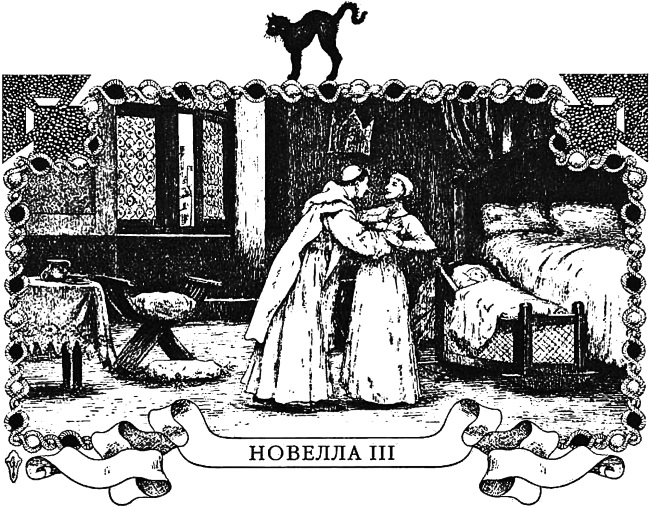 Поступая таким образом, они много раз сходились вместе. Случилось, между прочим, однажды, что, когда Федериго должен был ужинать с монной Тессой и она велела сварить двух жирных каплунов, Джьянни, который не должен был приехать, явился очень поздно. Дама очень огорчилась этим, он и она поужинали немного солониной, которую она распорядилась сварить особо, а служанке она велела отнести в белой салфетке двух вареных каплунов и несколько свежих яиц и бутыль хорошего вина в сад, куда можно было пройти, минуя дом, и где она иногда ужинала с Федериго; и она наказала ей положить все это у подошвы персикового дерева на краю лужка. Таковую она ощутила досаду, что позабыла приказать служанке подождать, пока придет Федериго, и предупредить его, что Джьянни здесь, а чтобы те вещи он забрал из сада. Вследствие этого, когда она с Джьянни легла в постель, равно как и служанка, не прошло много времени, как явился Федериго и раз тихонько постучался в дверь, которая была так близко от комнаты, что Джьянни тотчас же это услышал, а также и его жена, но, дабы Джьянни не мог возыметь к ней подозрения, она представилась спящей. Немного погодя Федериго постучался во второй раз; удивленный этим, Джьянни слегка толкнул жену и сказал: «Тесса, слышишь ли ты, что слышу я? В нашу-то дверь, кажется, стучатся». Жена, слышавшая то гораздо лучше его, притворилась, будто проснулась, и сказала: «Что такое? Что ты говоришь?» – «Я говорю, – сказал Джьянни, – что в нашу дверь, кажется, стучатся». Жена сказала: «Стучатся? Увы, мой Джьянни, ты разве не знаешь, что это такое? Это привидение, от которого я в эти ночи набралась страху больше, чем когда-либо, – такого страху, что, когда я услышала его, запрятала голову и не осмелилась высунуть ее, пока не рассвело». Тогда Джьянни сказал: «Ничего, жена, не бойся, если это и так, ибо, когда мы ложились в постель, я прочитал наперед Те lucis и Intemerata[80] и еще несколько других хороших молитв да еще перекрестил постель из конца в конец во имя Отца и Сына и Святого Духа, так что нечего бояться, чтобы оно могло повредить нам, какова бы ни была его сила». Но жена, дабы Федериго не возымел как-нибудь другого подозрения и не поссорился с нею, решилась совсем встать и дать ему понять, что Джьянни здесь, и она сказала мужу: «Хорошо, ты сказывай свое, а я, с своей стороны, не сочту себя покойной и безопасной, пока мы не заговорим его, так как ты кстати здесь». Говорит Джьянни: «А как его заговаривают?» Жена отвечала: «Я-то хорошо знаю, как его заговорить, ибо позавчера, когда я пошла в Фьезоле на отпуст, одна из тех странниц – уж такие-то они святые, Господь тебя в том заверь, мой Джьянни! – увидела, что я такая боязливая, да и научила меня святой, хорошей молитве и сказала, что много раз испытала ее, пока еще не была странницей, и всегда ей помогало. Но, Господь свидетель, у меня никогда не хватило бы смелости пойти одной испытать ее; теперь, когда ты здесь, пойдем-ка заклянем привидение».