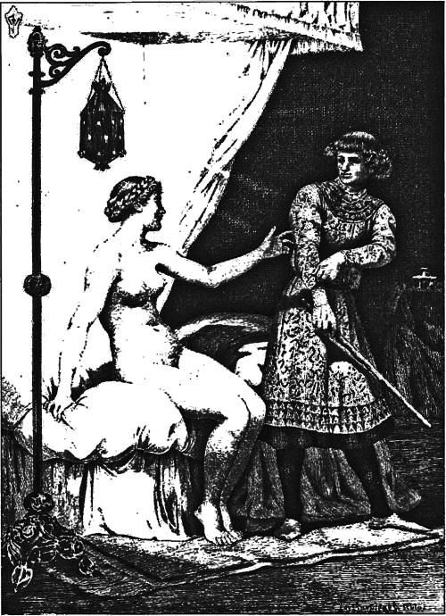 Случилось тем временем, что в нее, как женщину красивую и привлекательную, страшно влюбился один рыцарь, по имени мессер Ламбертуччио, к которому она, как человеку неприятному и противному, ни за что на свете не могла возыметь любви; а он сильно приставал к ней, засылая, и когда это не помогло, велел ей сказать, будучи человеком влиятельным, что опозорит ее, если она не склонится к его желаниям. Вследствие чего, боясь и зная, что то за человек, она решилась уступить его воле.