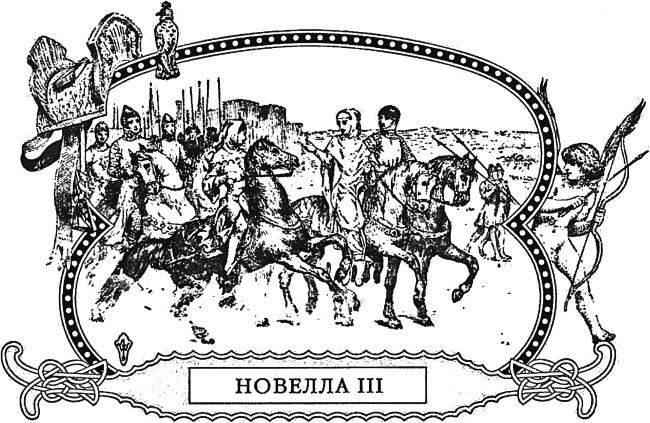 Уже солнце повсюду разлило своим светом новый день и птицы, распевая веселые песни на зеленых ветках, свидетельствовали о том во всеуслышание, когда дамы и трое юношей встали и пошли в сад, где, тихо ступая по росистой траве и плетя красивые венки из цветов, долгое время гуляли из одной стороны в другую. И как в прошедший день, так поступили и теперь: закусив, пока еще было прохладно, и занявшись пляской, они пошли отдохнуть; затем, встав в девятом часу, отправились, по усмотрению королевы, на свежий лужок и расселись вокруг нее. Она, красивая и привлекательная, с лавровым венком на голове, постояв в раздумье и окинув взором все общество, приказала Неифиле положить начало будущим рассказам. Та, без всяких оговорок, весело начала так рассказывать.