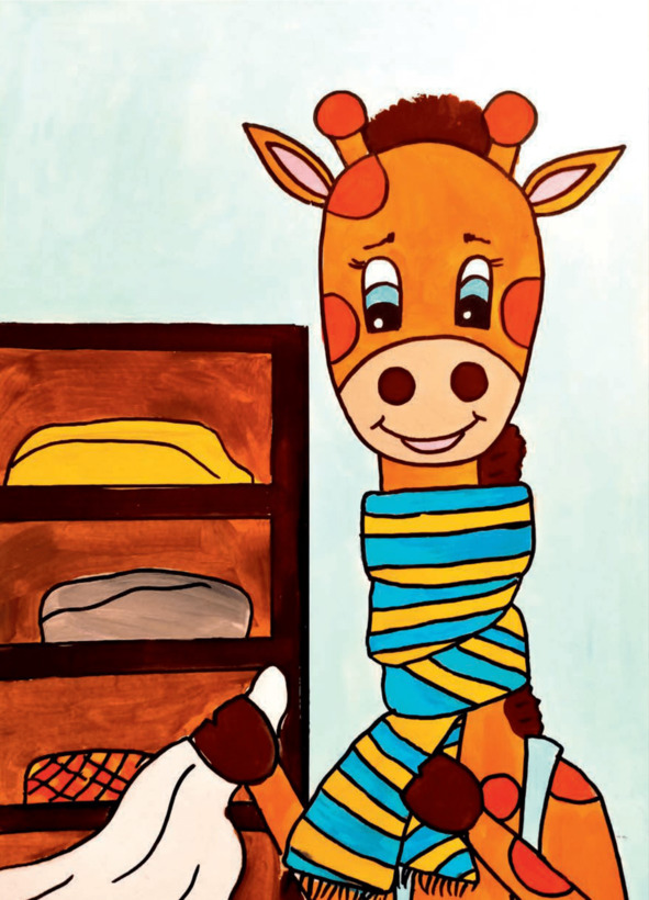 Как-то раз один жирафЗаглянул в свой старый шкаф,Долго там искал на полкахДлинный шарф – да все без толка!Этот мал, и этот мал,Он напрасно примерял…И тогда жираф решил,«Ох! Я выбился из сил.А куплю-ка шарфик новый —Самый модный и пуховый!»Подошел он к продавцу,Который провожал овцу,И спросил его тотчас:«Есть ли длинный шарф у Вас??»– Я помочь Вам буду рад!И без всяких лишних трат!Посмотрите эту полку —Вот зеленый шарф из шелка!Полосатенький примерьте —Очень Вам идет, поверьте!!!