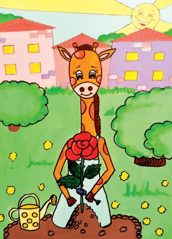 Поливал жирафик розуНу, а может быть, мимозу!Просто поливал цветокМаленький еще росток…Он в траве и не приметен,А когда подует ветер,То листочки шелестят,Словно что-то говорят…А жирафик понималИ сильнее поливал!!!Наконец цветка дождался —Каждый день им любовался!!!Ну и что же за цветокраспустился точно в срок???